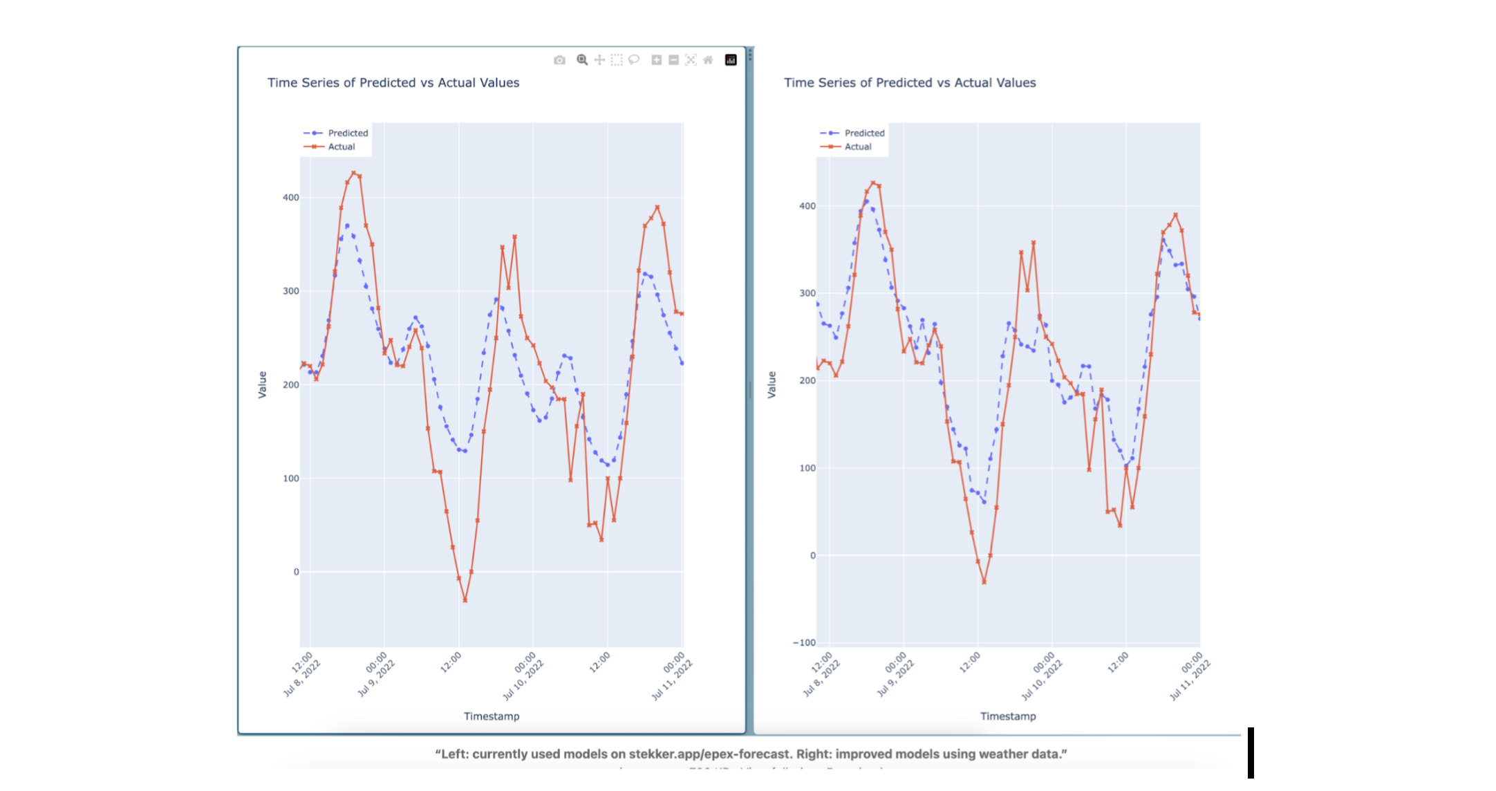 In blue the prediction, in red the reality. On the right you can see that we can get closer to reality with smarter weather forecasts. The closer to reality we can predict, the higher the value of our predictions.